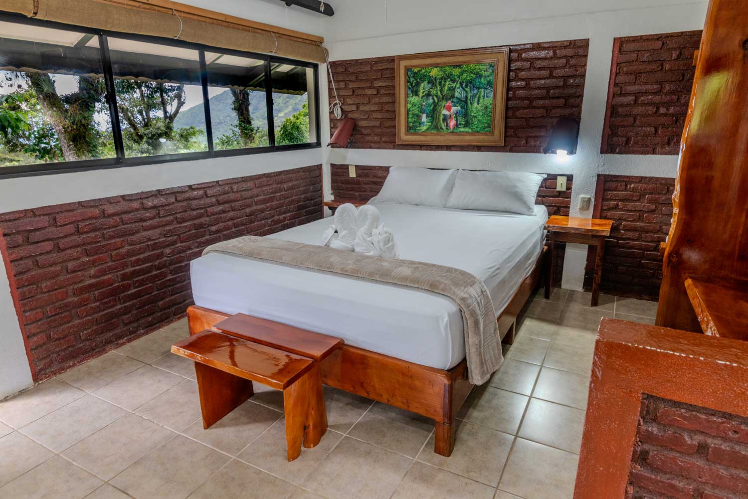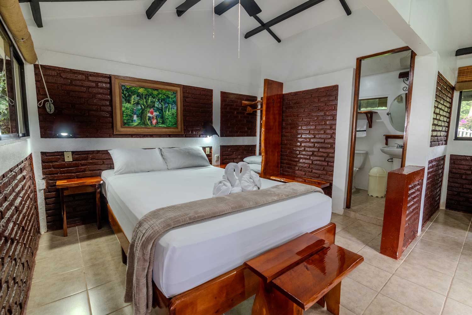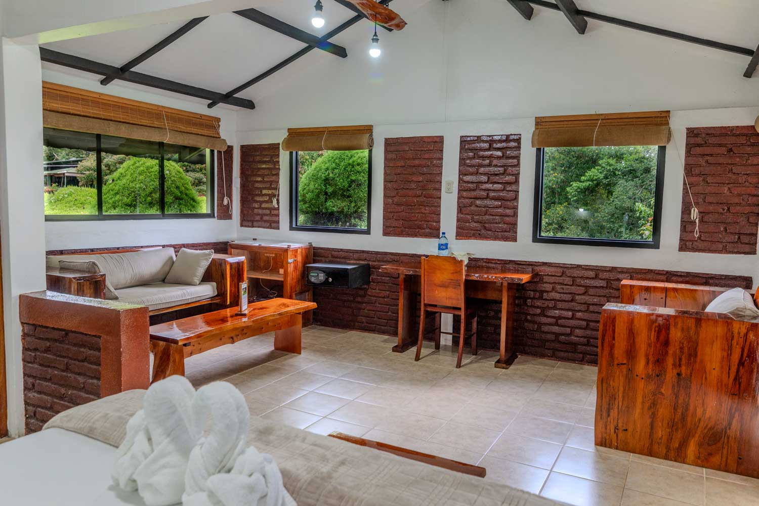 Nuestra cabaña estandar te recibe con su calida area de estar, un dormitorio principal con 1 Cama queen o 2 Camas unipersonales, espacio para tus piezas de ropa y caja fuerte para tus objetos de valor, cuenta con 1 baño completo
