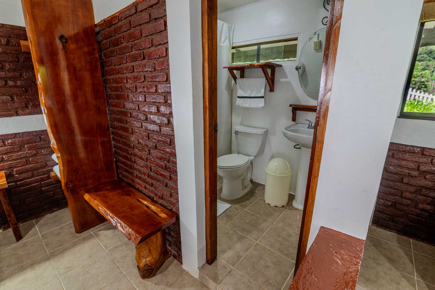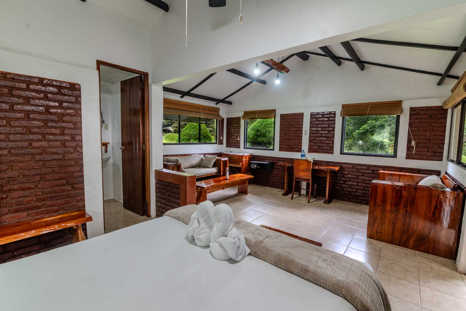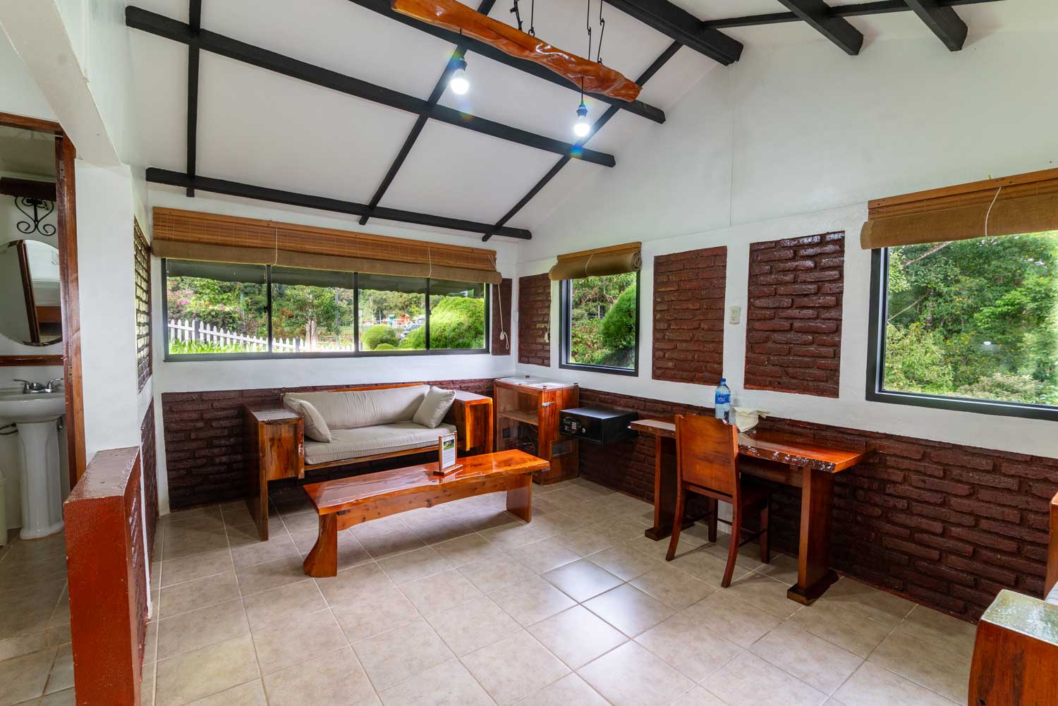 Nuestra cabaña estandar te recibe con su calida area de estar, un dormitorio principal con 1 Cama queen o 2 Camas unipersonales, espacio para tus piezas de ropa y caja fuerte para tus objetos de valor, cuenta con 1 baño completo