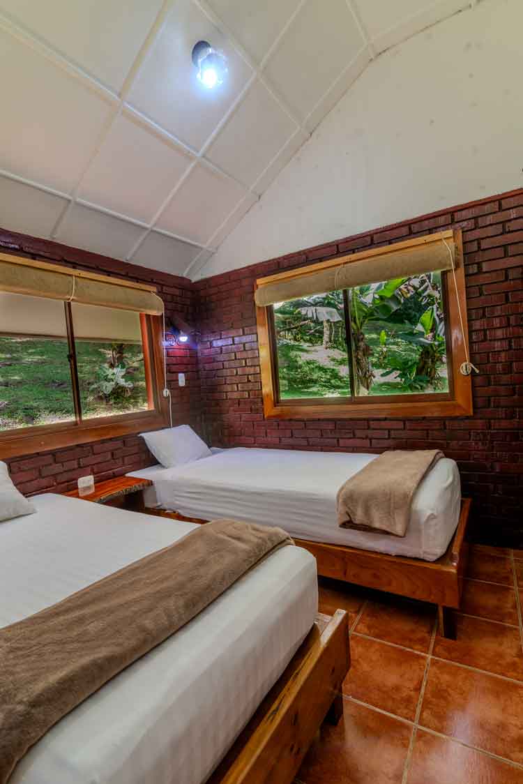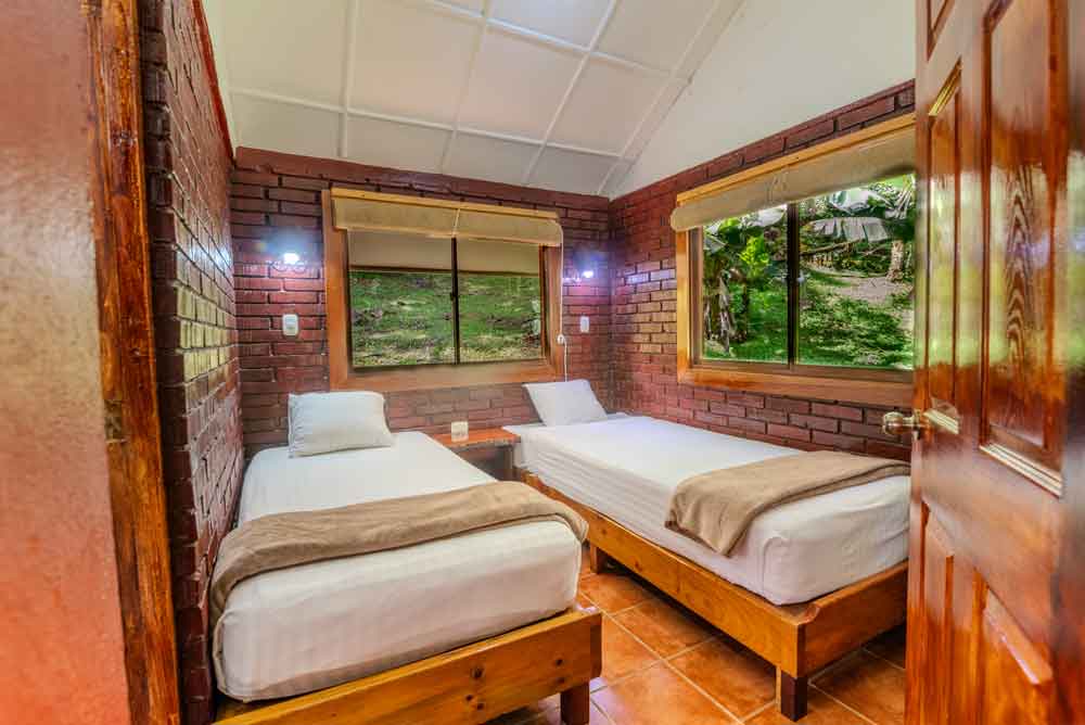 Nuestra cabaña de dos dormitorios te recibe en su calida area de estar, dos dormitorios: El principal con 1 Cama queen y dormitorio secundario con 2 camas unipersonales, espacio para tus piezas de ropa y caja fuerte para tus objetos de valor, cuenta con 1 baño completo