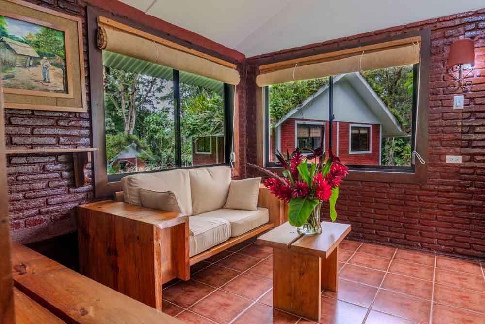 Nuestra cabaña estandar te recibe con su calida area de estar, un dormitorio principal con 1 Cama queen o 2 Camas unipersonales, espacio para tus piezas de ropa y caja fuerte para tus objetos de valor, cuenta con 1 baño completo