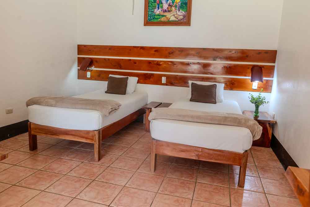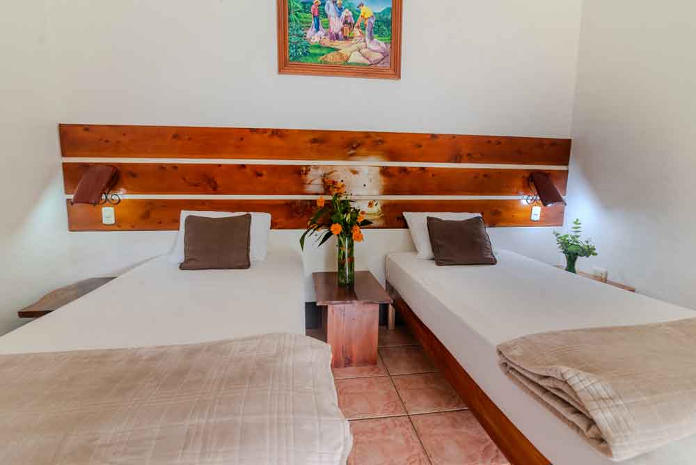 Habitacion tipo hotel, un dormitorio principal con 1 Cama queen o 2 Camas unipersonales, espacio para tus piezas de ropa y cuenta con 1 baño completo, con vista directa a nuestra laguna.